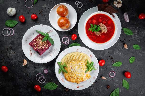 Картофель, помидоры, капуста, свекла, квашеный борщ, морковь, лук, зелень - 300 г/ Сartofi, roșii, varză, sfeclă, borș acru, morcov, ceapă, verdeață - 300 g