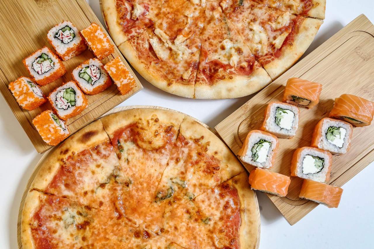 Калифорния с лососем, Специальный ролл, Филадельфия с лососем; Рис, нори, лосось, креветки, тобико, ангила, кунжут, сливочный сыр, огурцы, авокадо; Вес 980 г/ California cu somon, Special roll, Philadelphia cu somon; Orez, nori, somon, creveți, tobiko, angilă, susan, cremă de brânză, castraveți, avocado; Gramaj 980 g