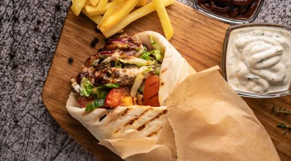 Lavas, carne de pui, sos paprika, sos de usturoi, varză, roșii, castraveți murați, cartofi pai. 400g
