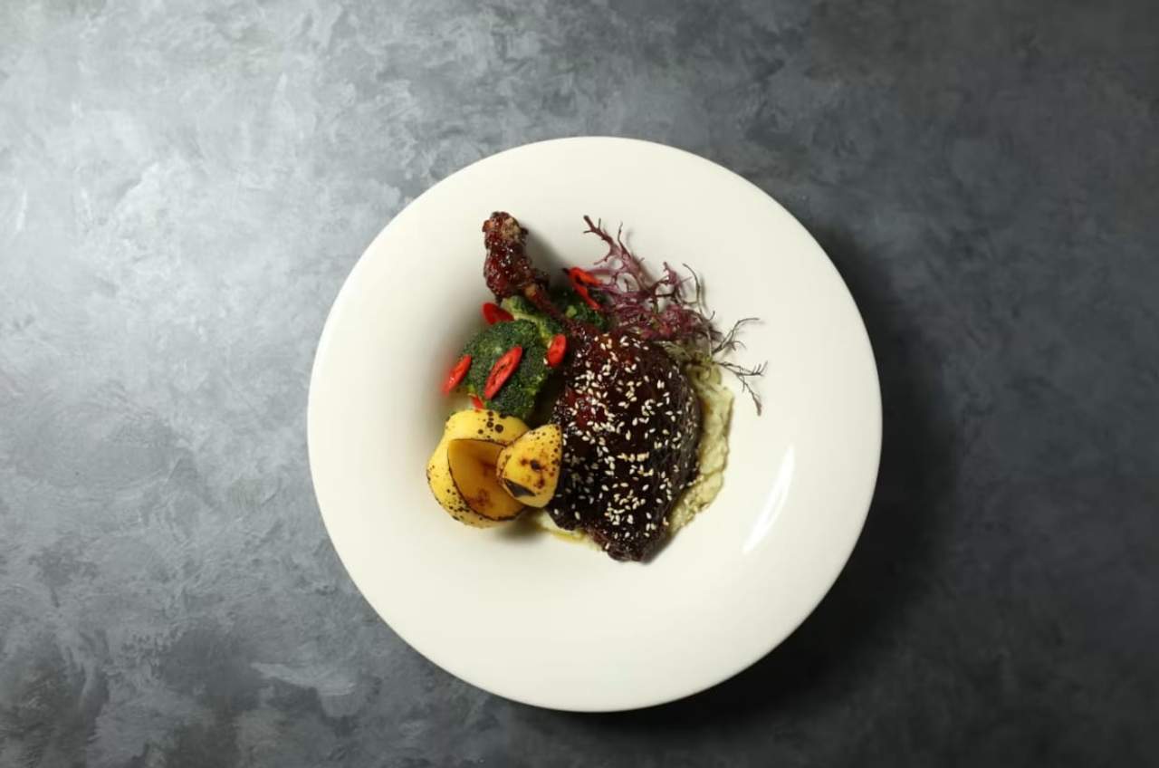 Ciolan de porc cu varza inabusita, piure de cartofi si pomusoare