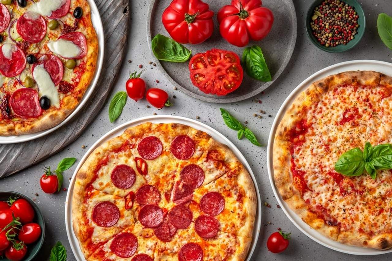 Pizza cu șuncă, măsline și ceapă roșie, sos de roșii - 590 g