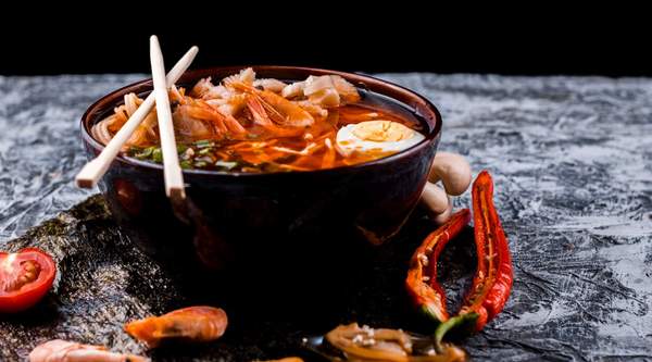 Bulion picant de porc și vită Tonkatsu Gyukotsu cu carne de porc fiartă de casă, tăiței cu ou, ou murat, ciuperci shiitake, morcovi sărați, spanac, ceapă verde, nori și semințe de susan- 550 gr.