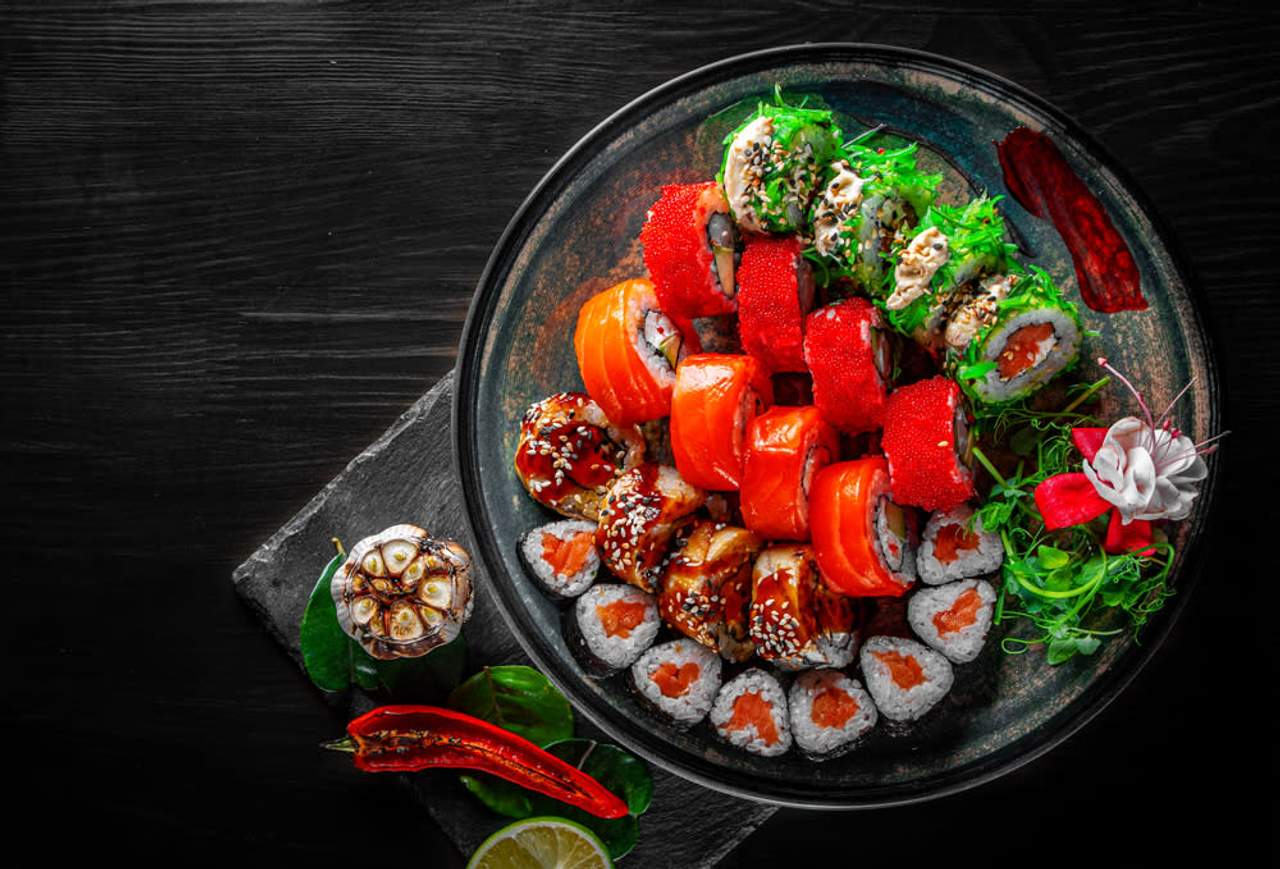 Mix de surimi, Castraveți, Somon, Tempura, Pesmet panko, Chipsuri de cartofi,Sos teriyaki, Ghimbir, Wasabi, Sos de soia.