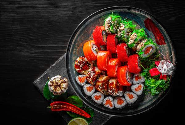 Cremă de brânză, Tobiko roșu, Mango, Creveți, Mentă, Somon, Sos teriyaki, Sos de soia, Ghimbir, Wasabi.