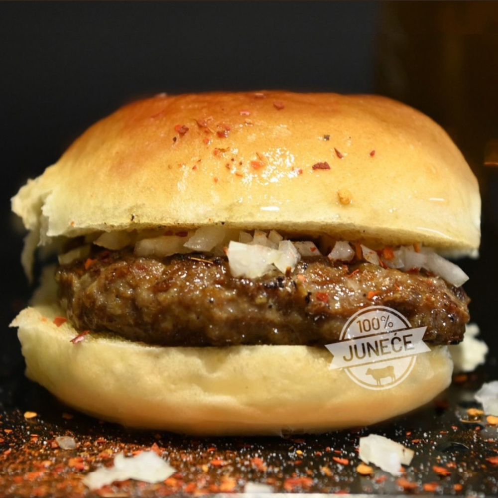 Klasična pljeskavica od 100% junećeg mesa, pažljivo začinjena i pečena na roštilju, sočnog i punog ukusa