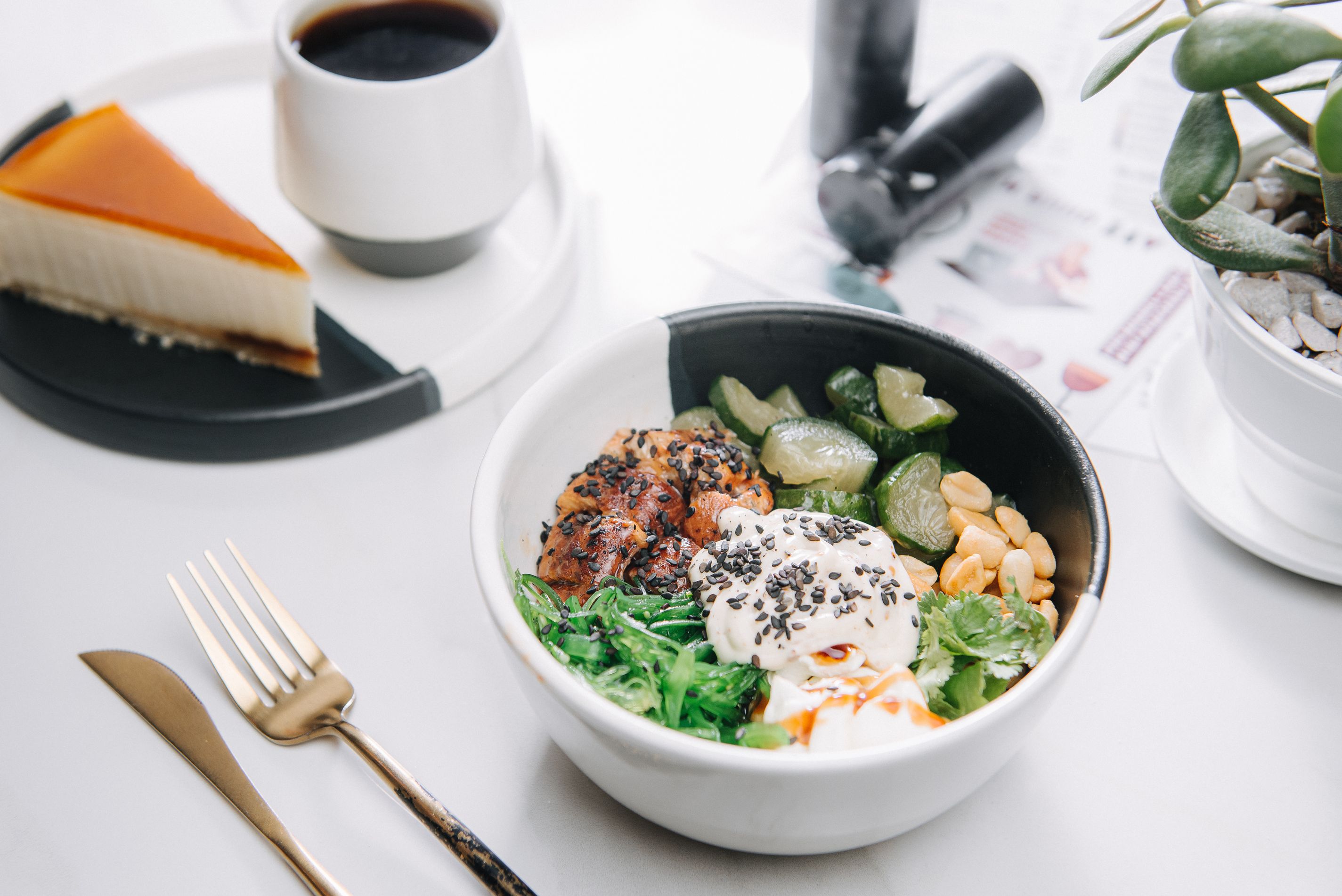 Sous vide chicken, Spicy sauce, guacamole, cherry tomatoes, herbs, cream cheese and teriyaki. Rice or a mix of quinoa and couscous to choose from.