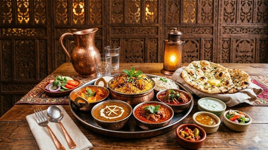 Riža, piletina i mješavina aromatičnih začina đumbir, bijeli luk, šafran, klinčić, kardamom, cimet s dimljenom aromom, gdje se koristi i ugalj za poseban miris i ukus. Prilozi uključeni