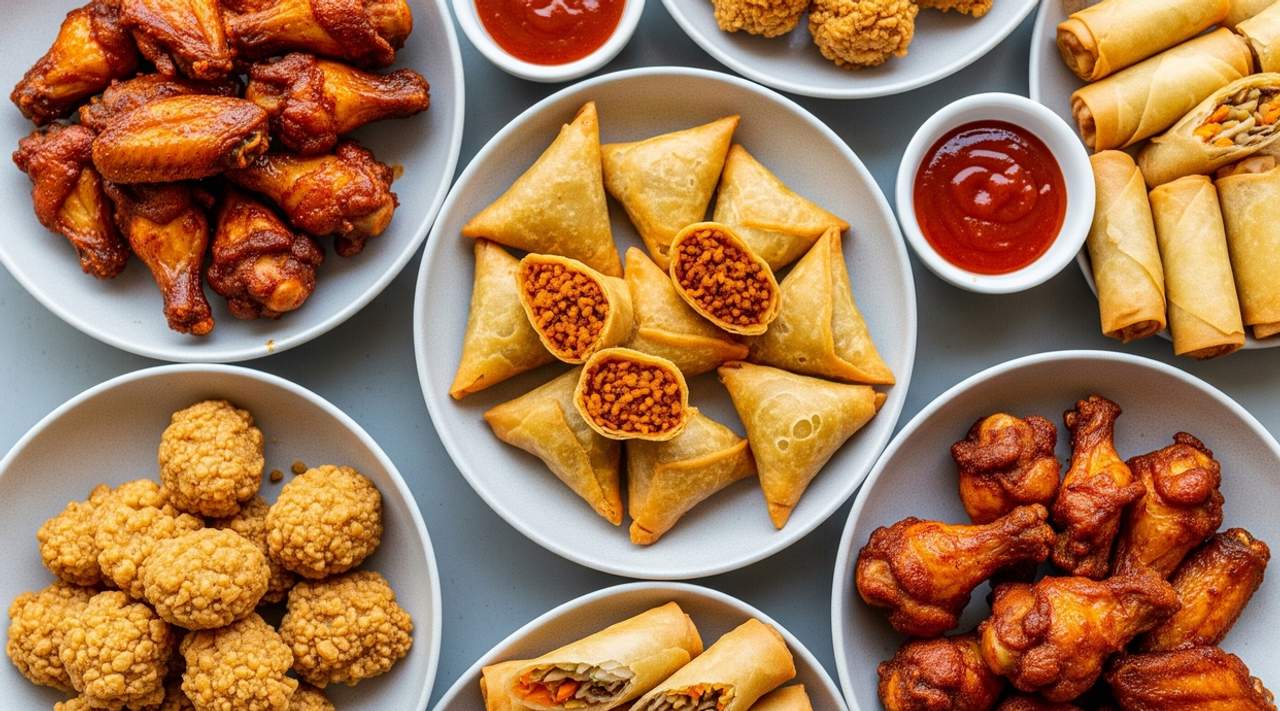 Puff, samosa, spring roll, chicken, beef