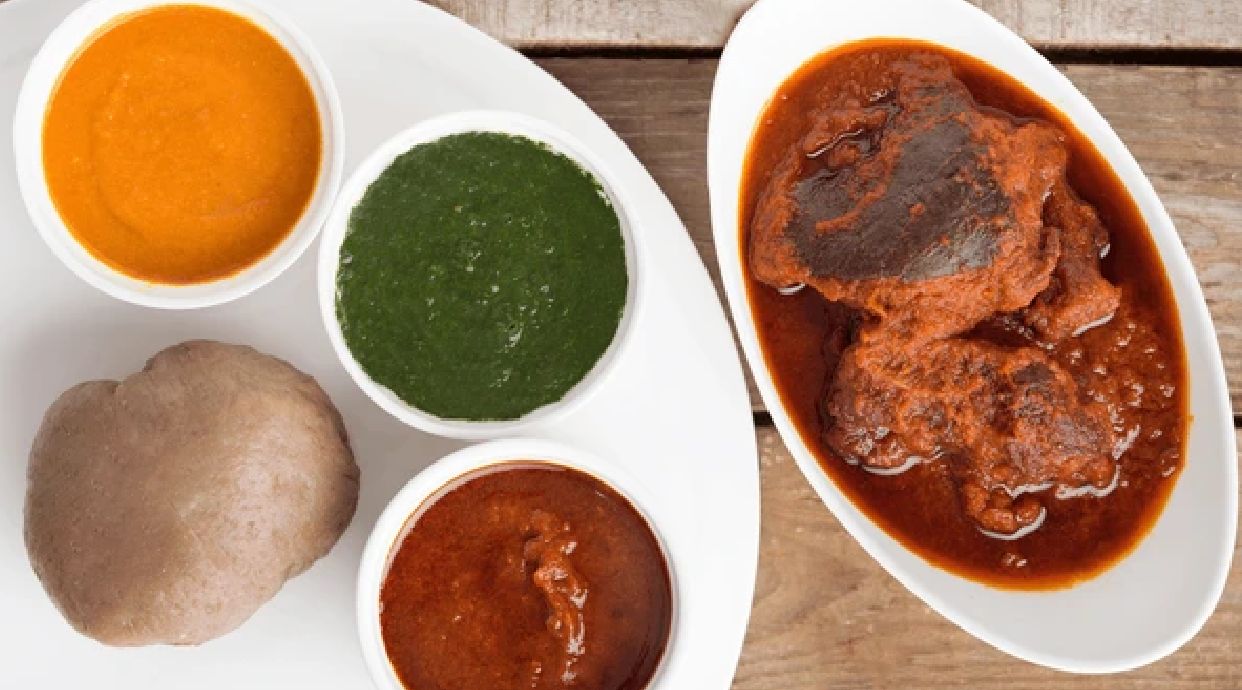 A combination of Ewedu (jute leaf soup) and Gbegiri (bean soup).