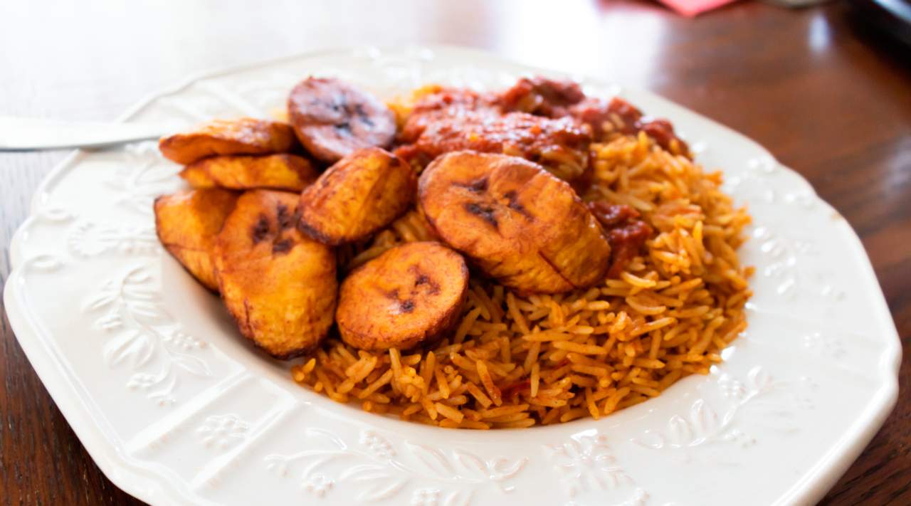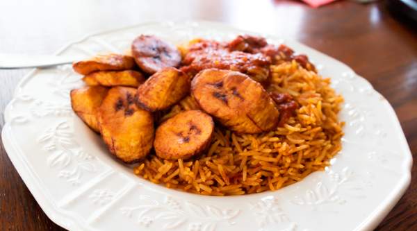 Tasty jollof rice served with plantain, with eitehr fish or chicken and a bottle of drink