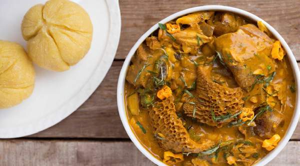 A tasty portion of Ofe Nsala served with goatmeat and swallow of choice