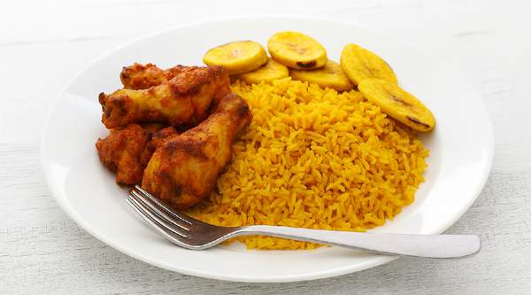 1 portion of fried rice, 1 portion of plantain, 2 soulfully fried chicken, and 35cl pet drink