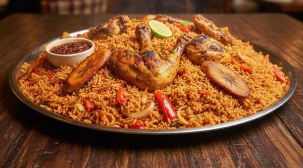 Features Gizzdodo (gizzard & plantain), croaker fish, Jollof spaghetti, and chicken nuggets