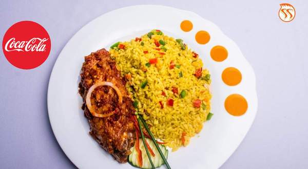Short grain rice cooked in stock and sweet garnishing, and stir-fried chicken with 50 cl Coca-Cola