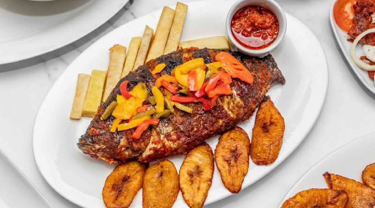 Spicy peppered goat meat served with rice and a side of yam, plantain, or sweet potato chips.