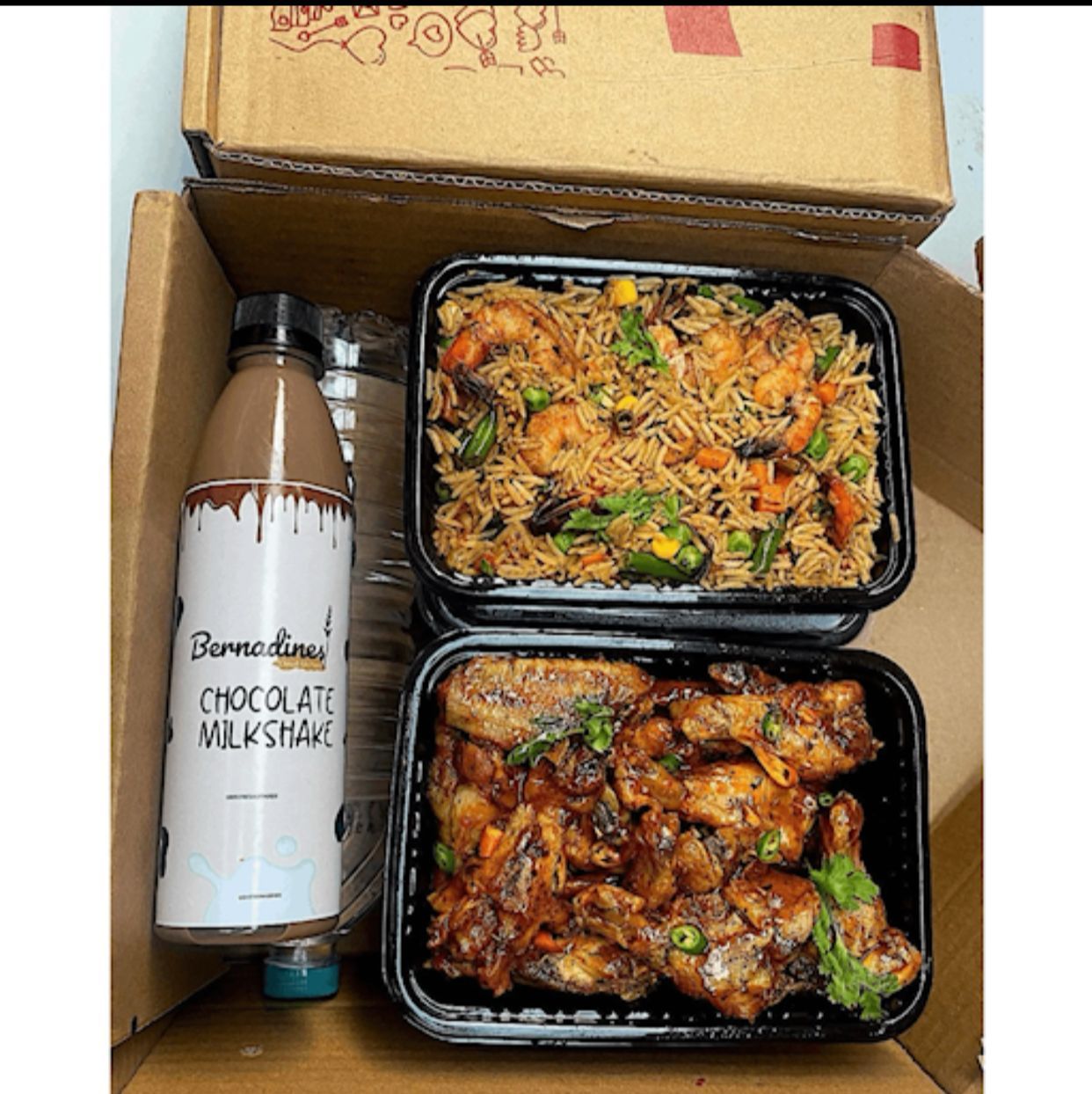 24pcs of wings, burger / shawarma, seafoood fried rice / spaghetti, shredded chicken / beef pasta, milkshake of choice & water.