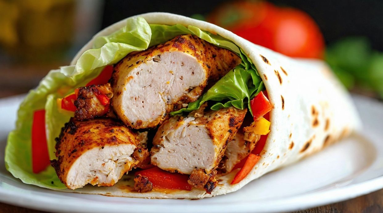 Thinly sliced cuts of vegetables and cream rolled into a large piece of pita bread with a choice of shredded chicken or beef and heated with single sausage
