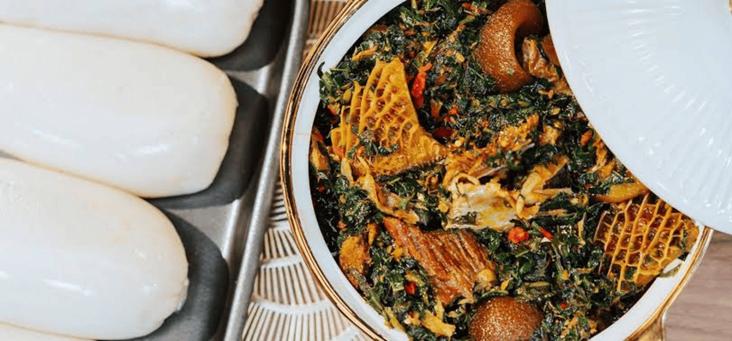 Freshly made Egusi soup served with Cowleg and Pounded Yam