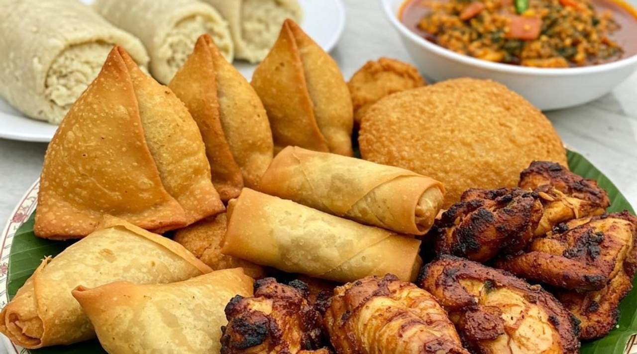 15 spring rolls 15 samosas 30 puff puff 20 mosas 7 sausages 10 chicken cuts 5 chunks of fried beef Slices of yam fries Chiller coke Peppered Sauce