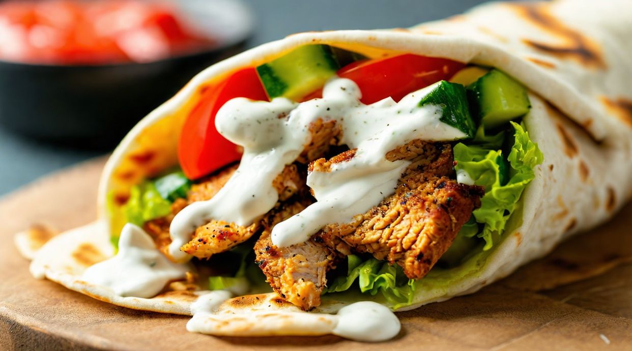 Chicken shawarma with one hot dog.