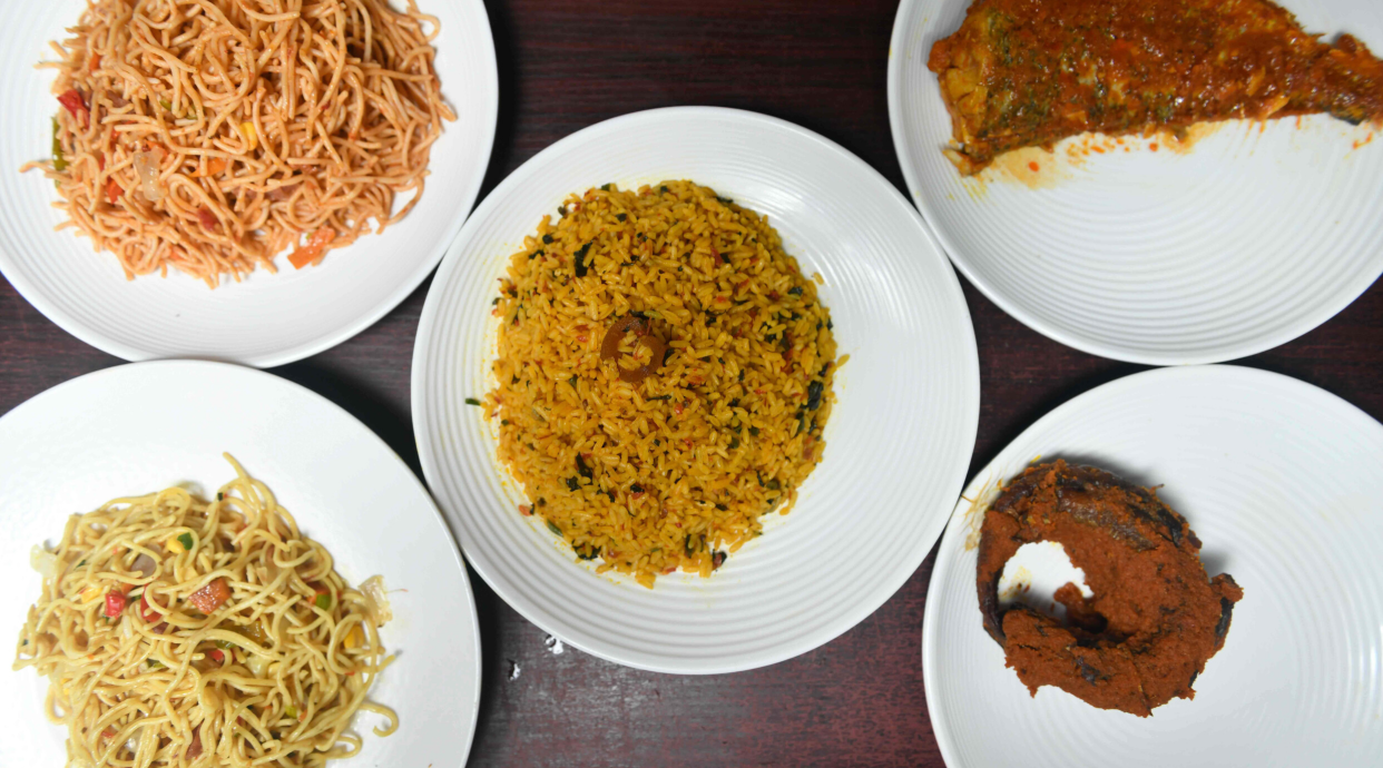 A classic Nigerian meal featuring fluffy, flavorful Jollof rice cooked with tomatoes, peppers, and aromatic spices. Served with ripe fried plantain or steamed Moi Moi, and your choice of fresh fish or Panla fish, perfectly seasoned.
