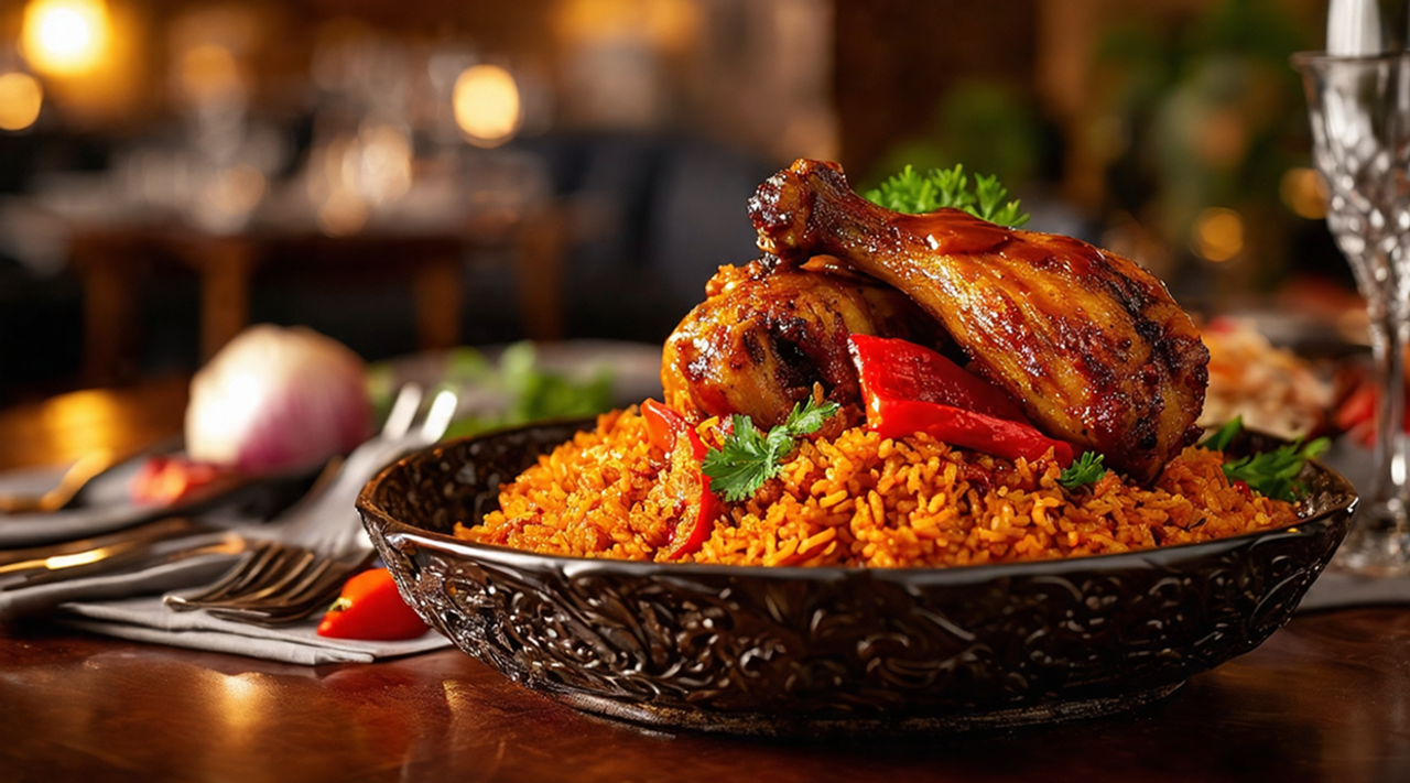 Spicy rice cooked in a flavorful tomato and pepper-based sauce, with onions, spices, and sometimes meat or vegetables