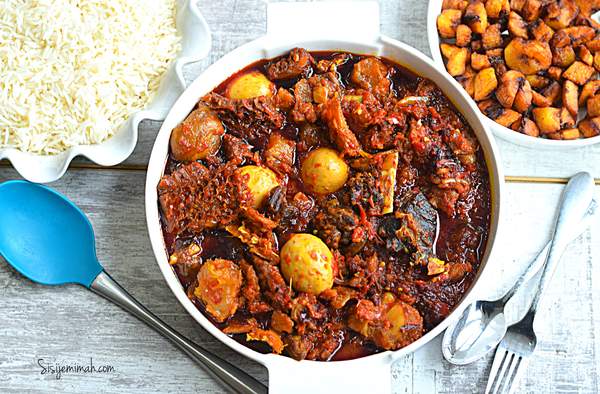 White rice with buka stew, plantain, one assorted and one boiled egg