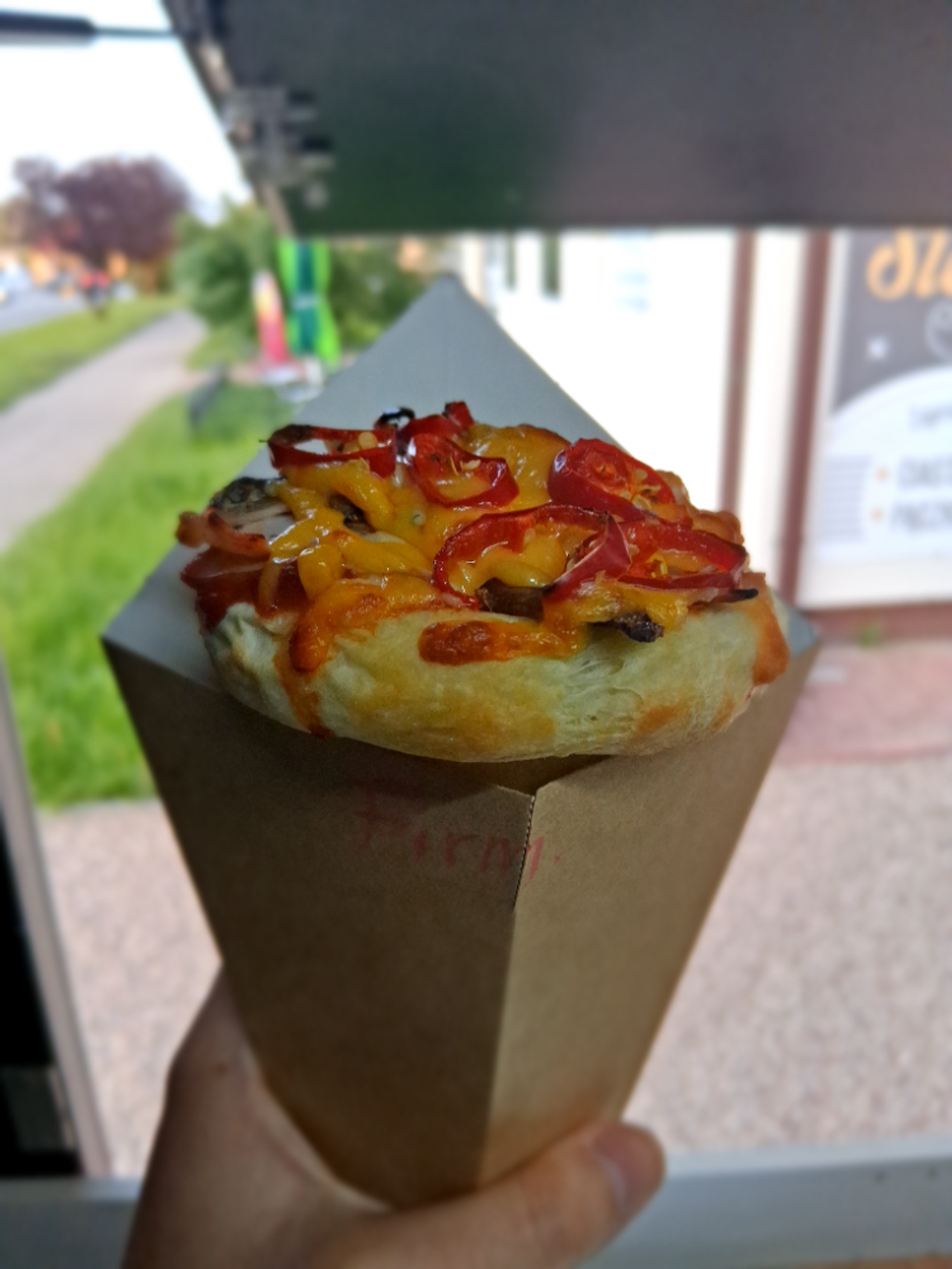 Rożek z sosem pomidorowym, serem mozzarella, serem cheddar, salami, pieczarkami.
