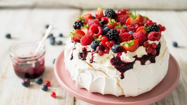 Miękka beza z delikatnie chrupiącą skorupką i płatkami migdałowymi. Kremowe nadzienie z dodatkiem likieru Baileys, konfiturą jeżynową oraz kremem karmelowym i praliną migdałową.