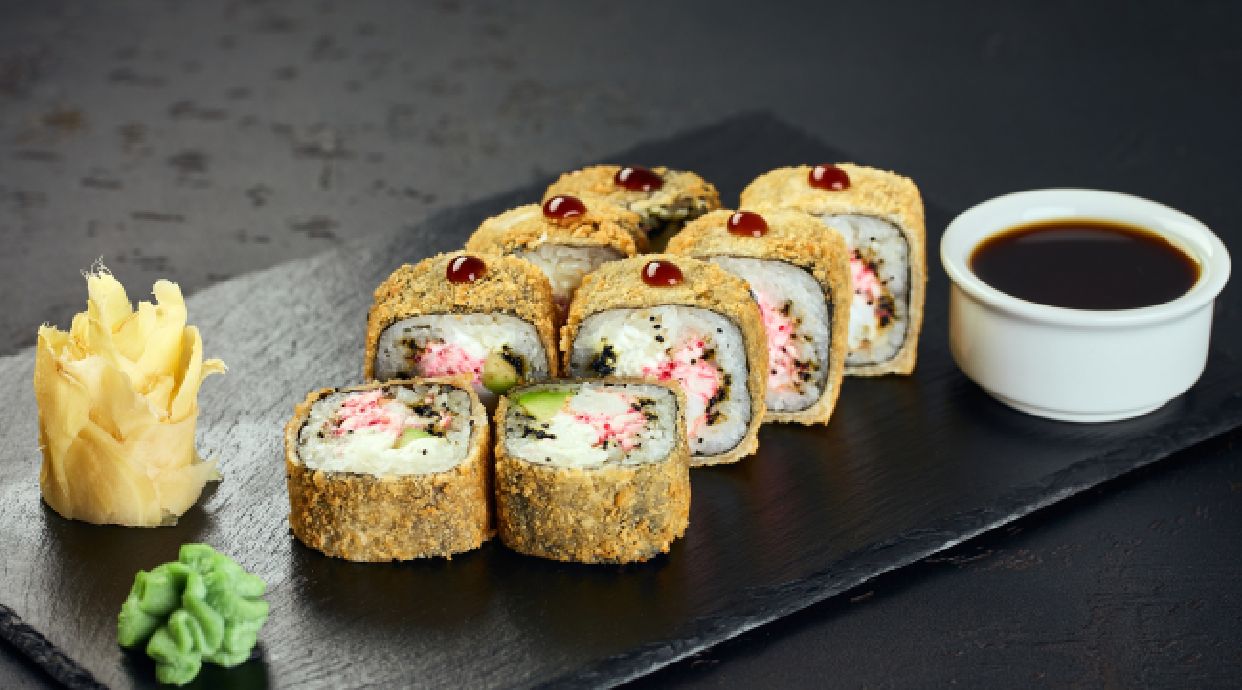 1. Uromaki halibut w tempurze, ogórek, rzodkiew, sezam 10szt