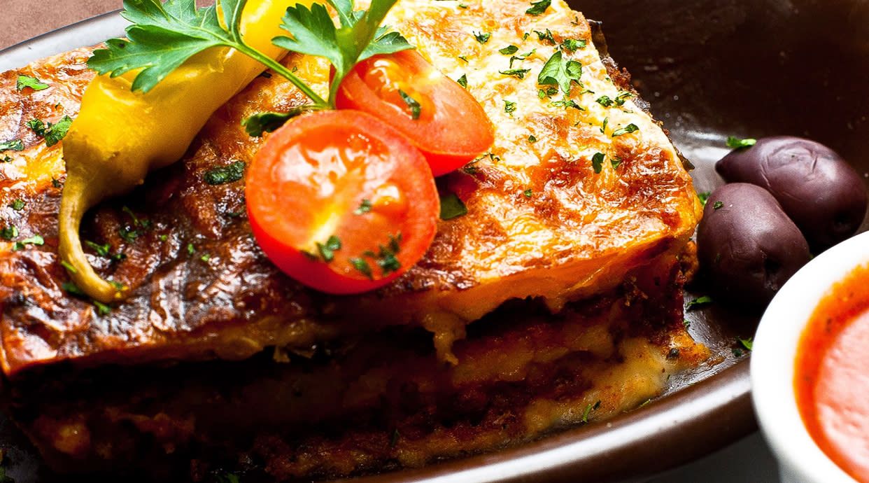 Prawdziwy grecki gyros w sosie metaxa, zapiekany pod serem mozzarella, talarki ziemniaczane, surówka