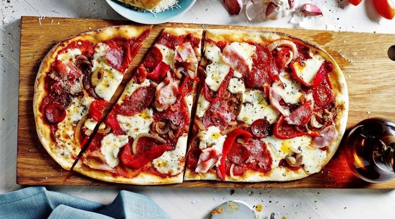 Boczek, salami peperoni, cebula, papryka czerwona, oliwa chilli