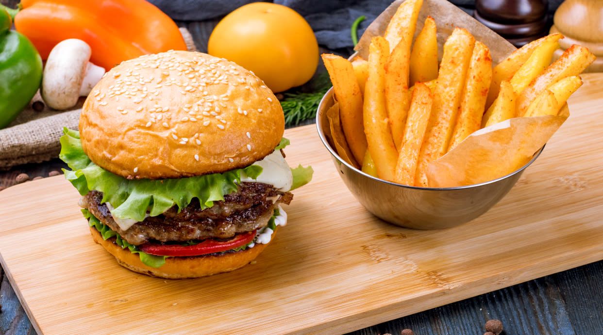 Podany z ziemniakami lub frytkami i zestawem surówek