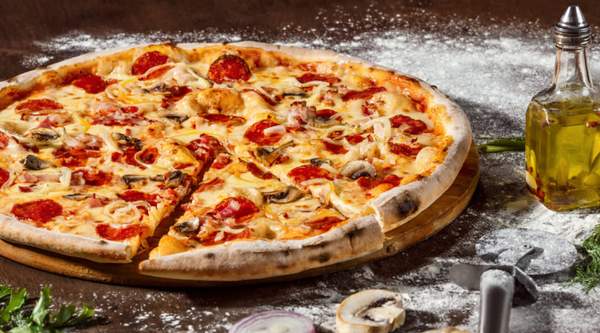 Sos, ser, pieczarki, boczek, oliwki, papryka, kukurydza, cebula, oregano
