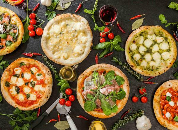 Sos pomidorowy, ser mozzarella, szynka gotowana włoska, salami napoli, pieczarki, czarne oliwki