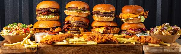 200g wołowiny, sałata lodowa, ogórek konserwowy, 2x bekon, panierowany kotlet serowy 125g , karmelizowana czerwona cebulka, sos bbq, sos szefa