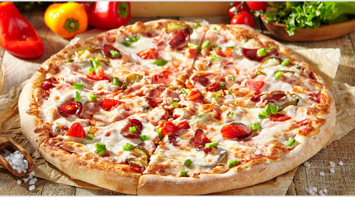 z serem, cebulą, bekonem, kawałkami kurczaka, kukurydzą i papryką świeżą