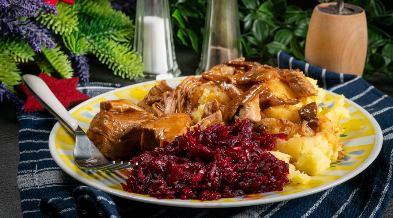 Kasza gryczana z pieczonym boczkiem, suszonymi śliwkami, cebulką i ziołami z sosem chrzanowym