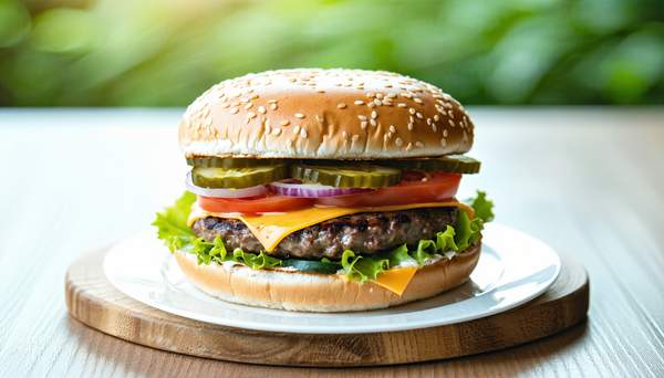Bułka burgerowa by zmączeni, kotlet wołowy, american cheese, ketchup, musztarda, bekon, sałata rzymska, ogórek piklowany, cebula