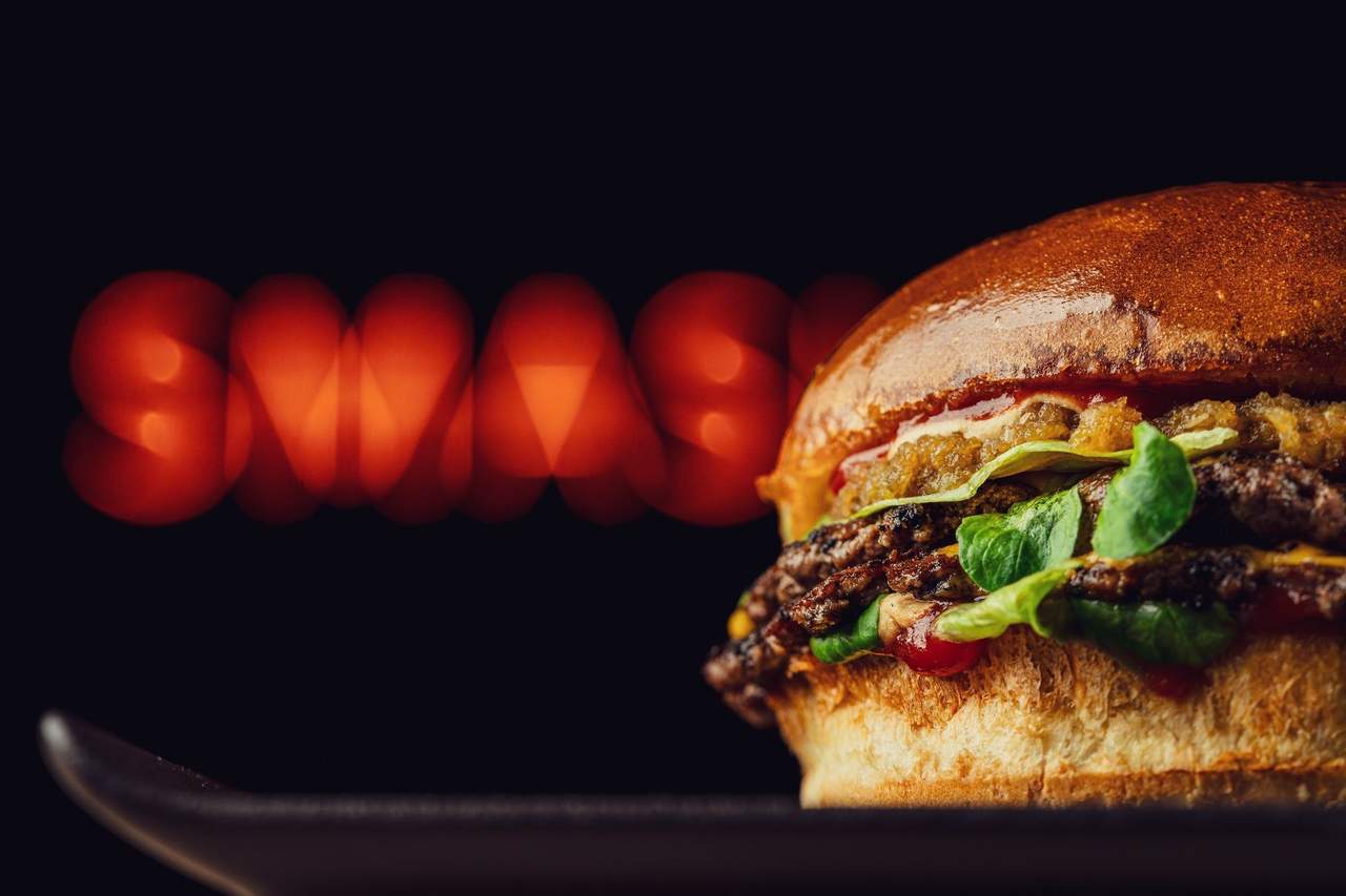 mayo aioli, sałata z roszponką, dżem bekonowo-cebulowy, sezonowana wołowina, ser wędzony, autorski boczek glazurowany sezam, sos serowy