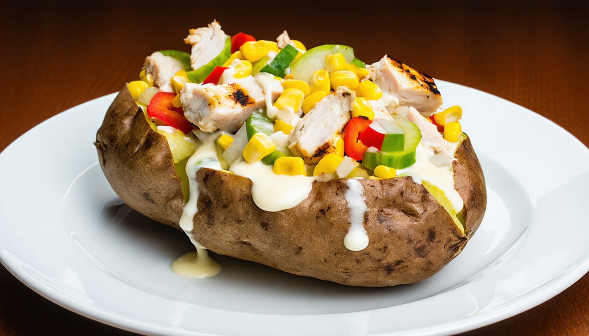 Pieczony ziemniak ok. 500g, masło, sól, pieprz, pierś z kurczaka, boczek, kiełbasa wysokogatunkowa, cebula, ser, sos do wyboru