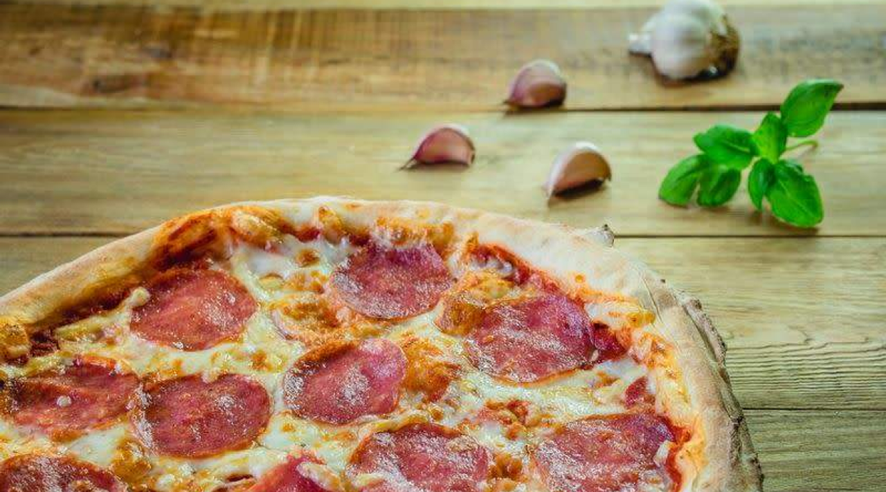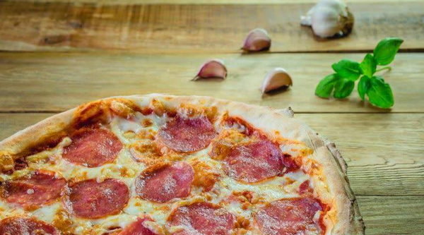 Sos pomidorowy, ser, cebula, papryka, szynka, pieczarki, bekon, salami, czosnek, ser