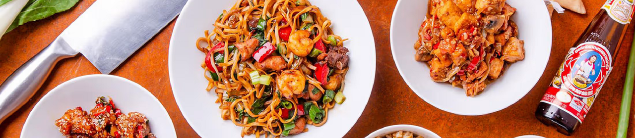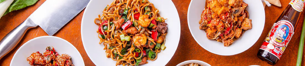 makaron chow main, Sos chowmain, Czerwona papryka, Kapusta pekińska, Pędy fasoli mun, kurczak udko, Wołowina, Krewetki, olej sezamowy