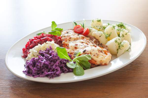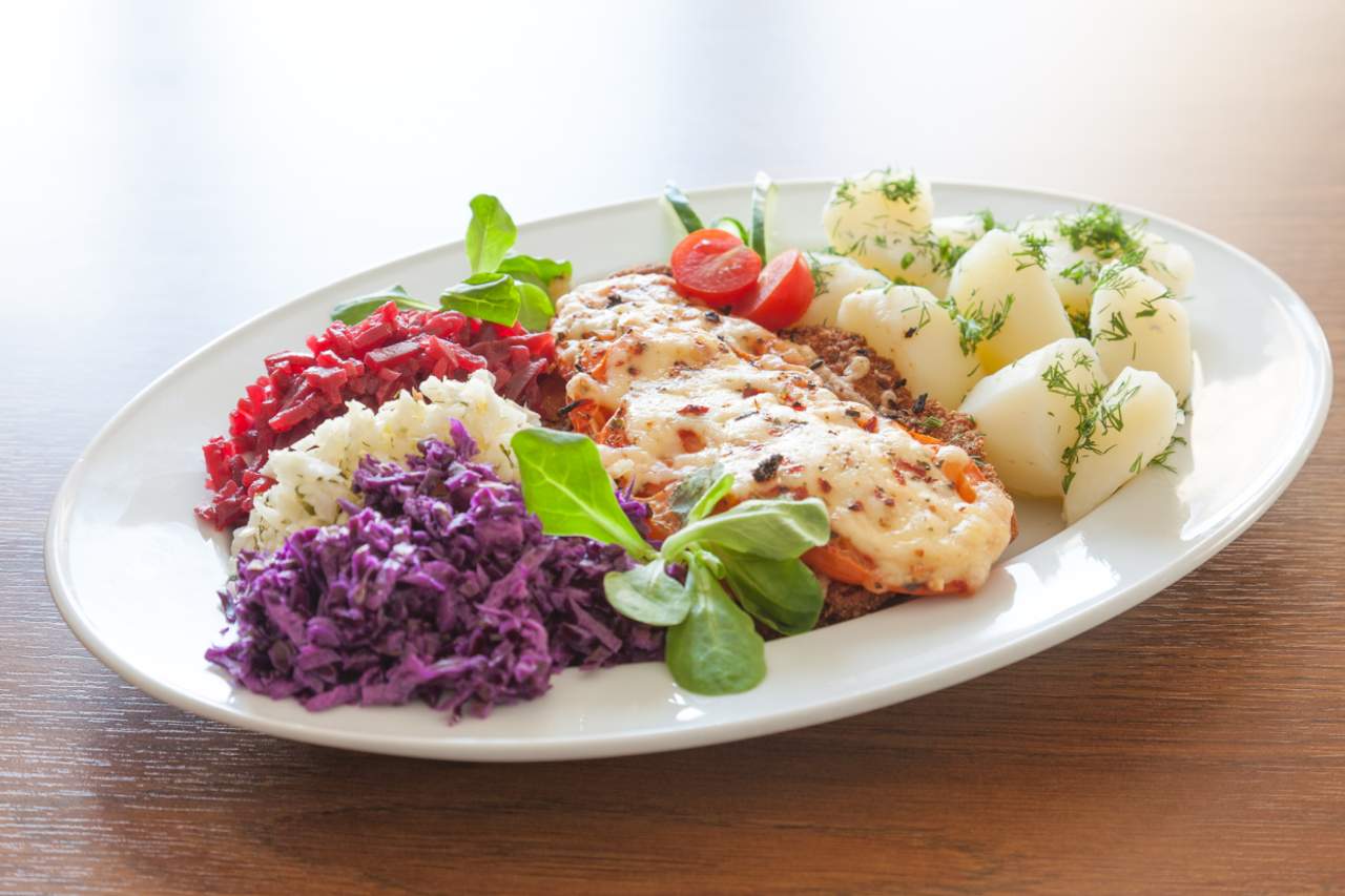 Schabowy zapiekany z pieczarkami i serem w zestawie