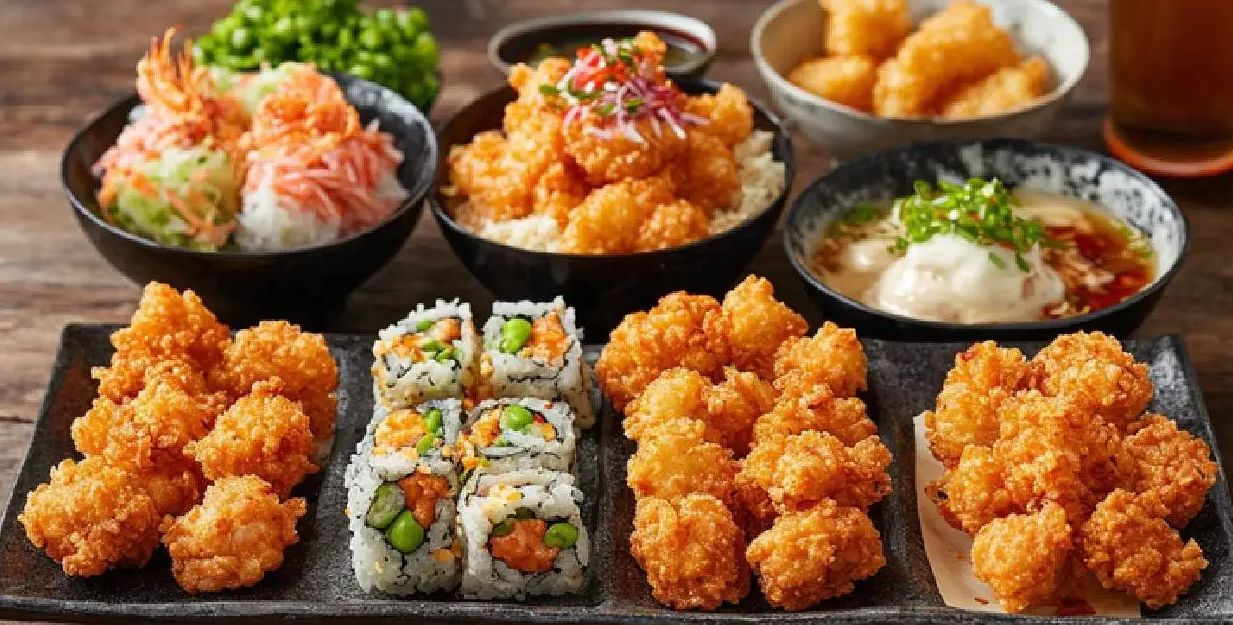 krewetka w panko, łosoś, ogórek i ser, ryż, nori