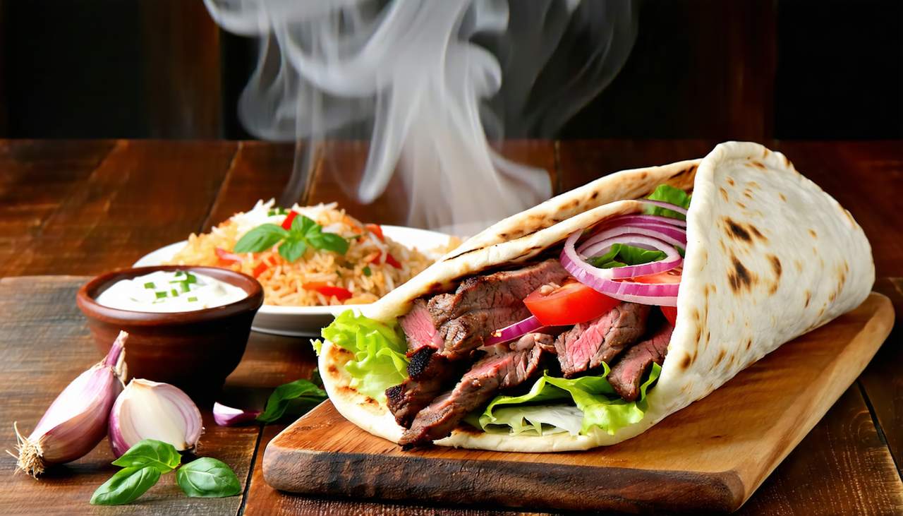 Mięso, warzywa, sos w chlebie pita. Może zawierać alergeny. Zdjęcie poglądowe