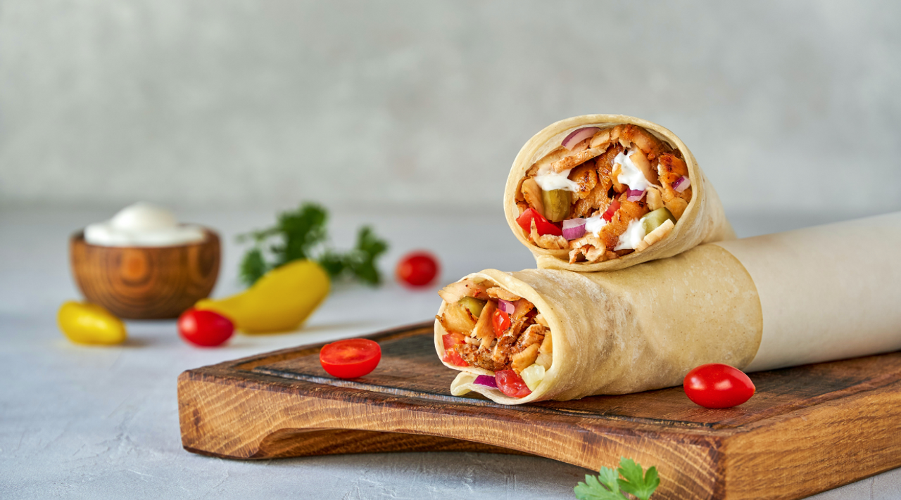 Tortilla, mieso, salatka lodowa, pomidor, ogorek, sos