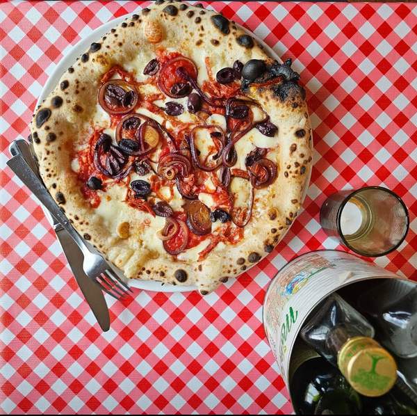 Pomidory san marzano, mozzarella, salami spianata picante, pieczarki marynowane, oliwki czarne, mascarpone, starta skórka z cytryny