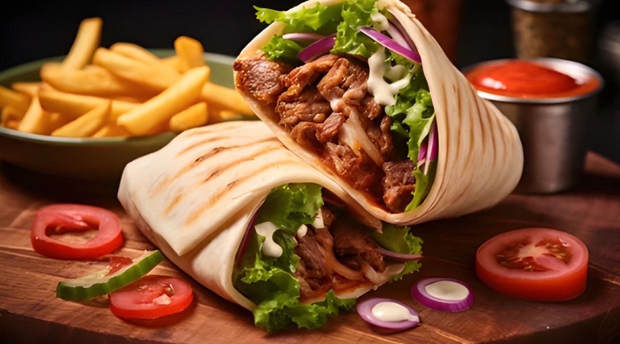 Cienki chleb pita, pieczone mięso, surówka, ogórek, pomidor, sos, pasta czosnkowa