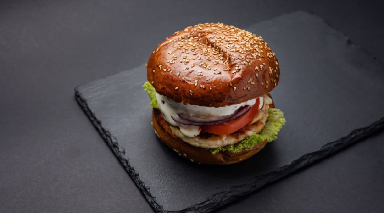 Sos burgerowy, sałata, pomidor, ogórek konserwowy, czerwona cebula, sos bbq